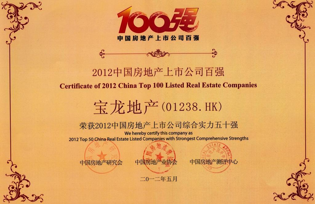 寶龍地產(chǎn)榮膺“2012中國房地產(chǎn)上市公司綜合實力50強”及“2012中國房地產(chǎn)上市公司風(fēng)險控制五強”