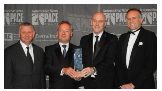 領(lǐng)受2012年《汽車新聞》汽車供應(yīng)商杰出貢獻(xiàn)獎(PACE)的博格華納(BorgWarner)高層(從左至右):博格華納渦輪增壓系統(tǒng)(BorgWarner Turbo Systems)的高級工程總監(jiān)斯特凡·穆茲博士(Stefan Muenz)、博格華納渦輪增壓系統(tǒng)(BorgWarner Turbo Systems)的全球乘用車產(chǎn)品總裁兼總經(jīng)理弗雷德里克·利薩爾德(Frederic Lissalde)、博格華納(BorgWarner)的首席運營官詹姆斯·維利亞(James Verrier)、博格華納渦輪增壓系統(tǒng)(BorgWarner Turbo Systems)的工程副總裁阿諾·施瓦茨(Arno Schwar)。