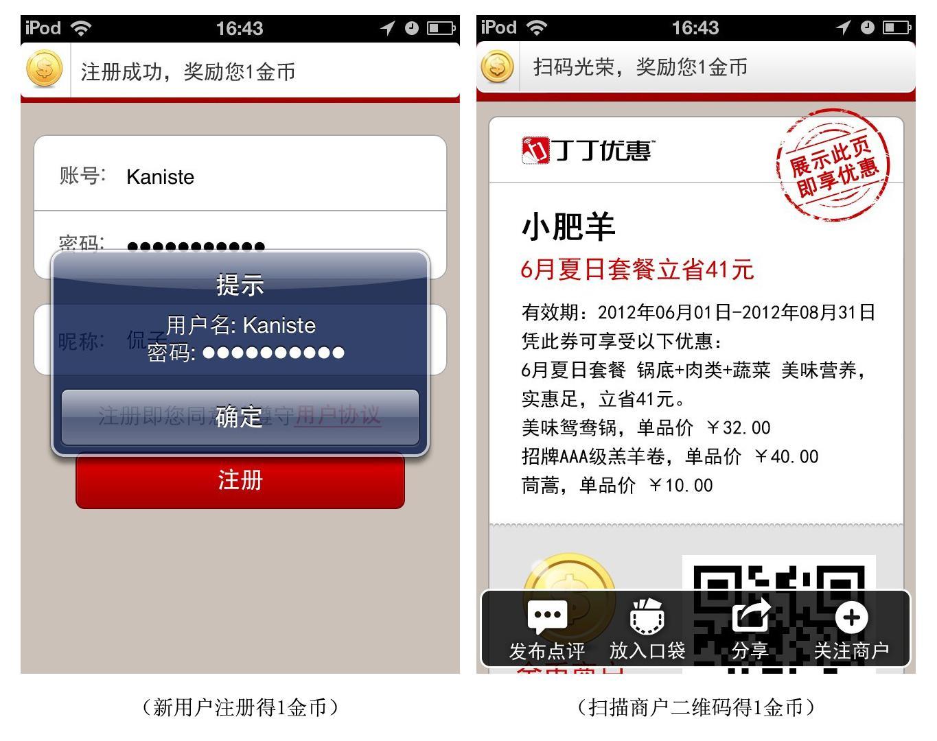 那么怎么獲得金幣呢?其實(shí)很簡(jiǎn)單,金幣的獲取也都是免費(fèi)的。例如,注冊(cè)新用戶(hù)可以獲得1金幣;每天首次登陸就有5銀幣到手;掃描商戶(hù)的二維碼門(mén)貼就有1金幣進(jìn)賬;通過(guò)短信或微博分享優(yōu)惠券也能賺到1銅幣。