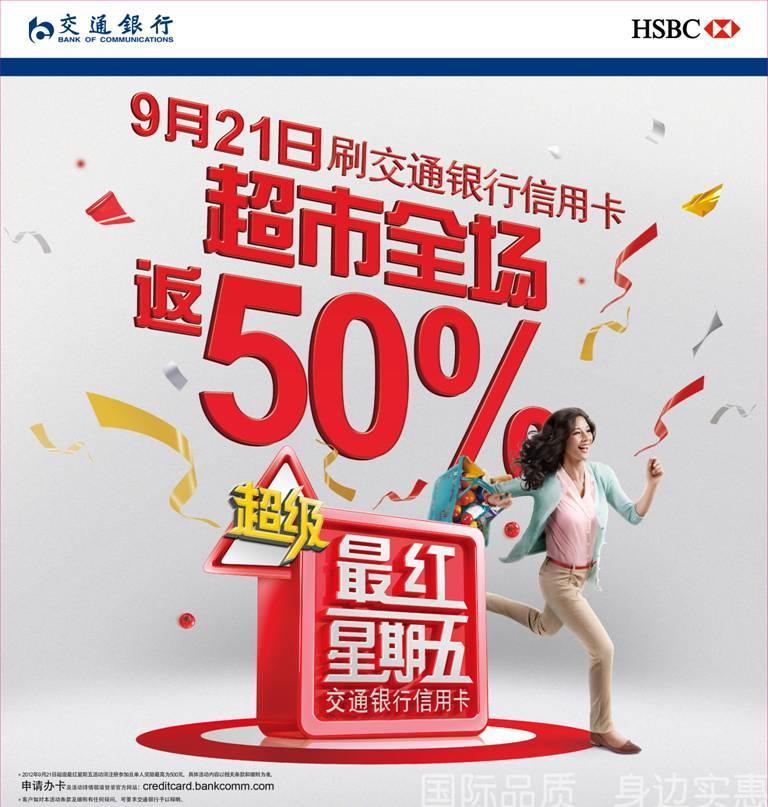 9月21日前,交通銀行信用卡持卡人通過交通銀行信用卡網(wǎng)站 http://creditcard.bankcomm.com 或直接撥打語音熱線4008893000注冊“最紅星期五超市活動”后就可參與“超級最紅星期五”活動,同一持卡人名下所有交通銀行信用卡均可參加。持卡人注冊成功后,于9月21日活動當(dāng)天在全國各城市“超級最紅星期五”合作超市內(nèi),任一單筆刷卡消費滿128元人民幣,便可享受50%的高額刷卡金返還,較高可享500元刷卡金返還。