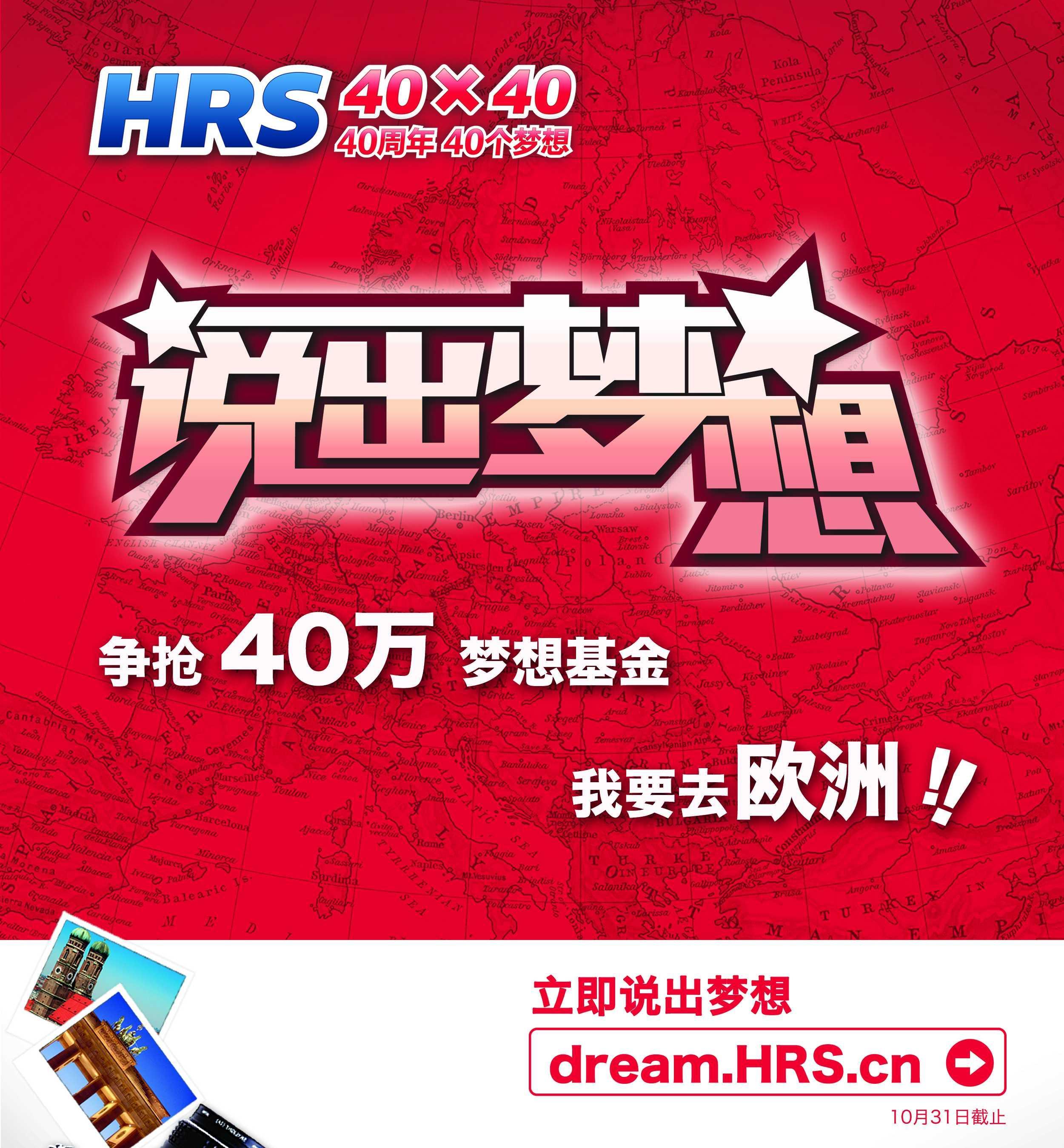 “HRS 40周年 40個夢想”于9月1日正式啟動。您可以通過HRS中文官方網(wǎng)站HRS.cn,進(jìn)入“HRS40周年 40個夢想”的活動頁面進(jìn)行報名,寫下您的歐洲夢想。通過網(wǎng)上投票,以及HRS和權(quán)威旅游媒體的評比,其中40名參加者將獲得HRS提供的1萬元的夢想基金,以輕松完成歐洲之旅的夢想。獲獎名單將分別于9月底和10月底公布,詳情請登陸http://dream.hrs.cn/。