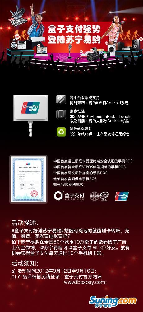 深圳2012年9月13日電 /美通社/ -- 近日,盒子支付與蘇寧易購的全面合作已經(jīng)在全國全面啟動。雖然在此之前,盒子支付也與許多電商有過合作,但都集中在渠道銷售方面,或者單項的移動支付方案合作。而本次與蘇寧易購的合作,是盒子支付與全國性大型電商之間的首次全面性合作。盒子支付市場總監(jiān)相如表示:“這次盒子支付與蘇寧易購的強強聯(lián)合,雙方不僅會更加注重渠道銷售的合作,同時也會在移動支付方式、聯(lián)合營銷推廣、會員服務等各個方面開展。”