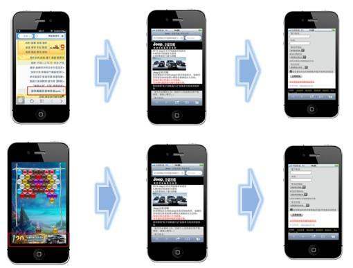 Jeep 以男性為主的受眾人群特性,力美廣告精選新聞、財(cái)經(jīng)、資訊、體育等手機(jī) WAP 及APP媒體,借助力美廣告平臺(tái)優(yōu)勢(shì),采取機(jī)型定向技術(shù),鎖定高端智能機(jī)手機(jī)用戶,精準(zhǔn)覆蓋目標(biāo)受眾。針對(duì) WAP 網(wǎng)站,潛在用戶可點(diǎn)擊 Banner 后進(jìn)入全屏廣告,并可登陸試駕頁(yè)面,填寫相關(guān)信息,申請(qǐng)?jiān)囻{;針對(duì) APP 內(nèi)置廣告,潛在用戶可點(diǎn)擊 Banner 后直接跳轉(zhuǎn)至活動(dòng)移動(dòng)頁(yè)面。