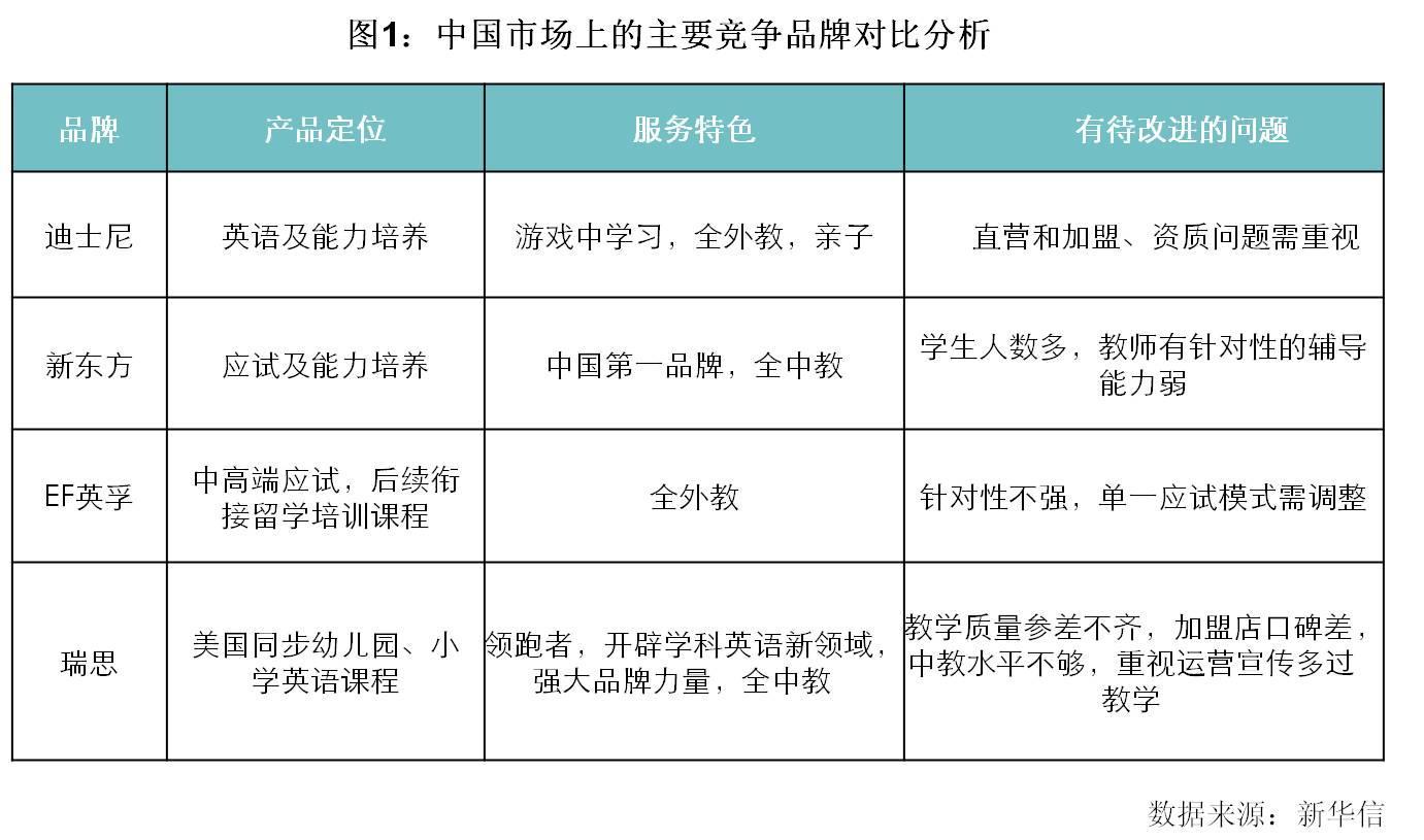 經(jīng)過(guò)十多年的發(fā)展,我國(guó)的少兒英語(yǔ)培訓(xùn)各種品牌的市場(chǎng)定位也越來(lái)越清晰,由此可以看出,市場(chǎng)細(xì)分將成為今后少兒英語(yǔ)培訓(xùn)的一個(gè)發(fā)展趨勢(shì)。在這個(gè)市場(chǎng)上,有依托原有品牌,逐步向少兒培訓(xùn)領(lǐng)域擴(kuò)張的新東方、英孚,亦有同迪士尼一樣,由國(guó)際教育巨頭“空降”中國(guó)的瑞思學(xué)科英語(yǔ)。這塊“蛋糕”的爭(zhēng)奪戰(zhàn),已經(jīng)愈演愈烈。教育巨頭營(yíng)銷理念全方位“博弈”,中國(guó)市場(chǎng)上主要的競(jìng)爭(zhēng)品牌對(duì)比分析如下(圖1):