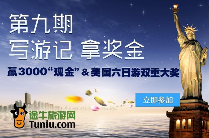北京和上海2012年9月25日電 /美通社/ -- 途牛旅游網(wǎng)“寫游記,拿大獎(jiǎng)”活動(dòng)已經(jīng)開展到第九期。自活動(dòng)開啟以來,許多旅游達(dá)人踴躍參與,參賽游記繽紛多彩,讓“圍觀”眾人不但大飽眼福,還了解到了許多實(shí)用攻略。目前,第九期寫游記正在火熱進(jìn)行中,現(xiàn)在到途牛旅游網(wǎng)社區(qū)發(fā)表游記,就有機(jī)會(huì)贏得3000元“現(xiàn)金”和美國游雙重大獎(jiǎng)。