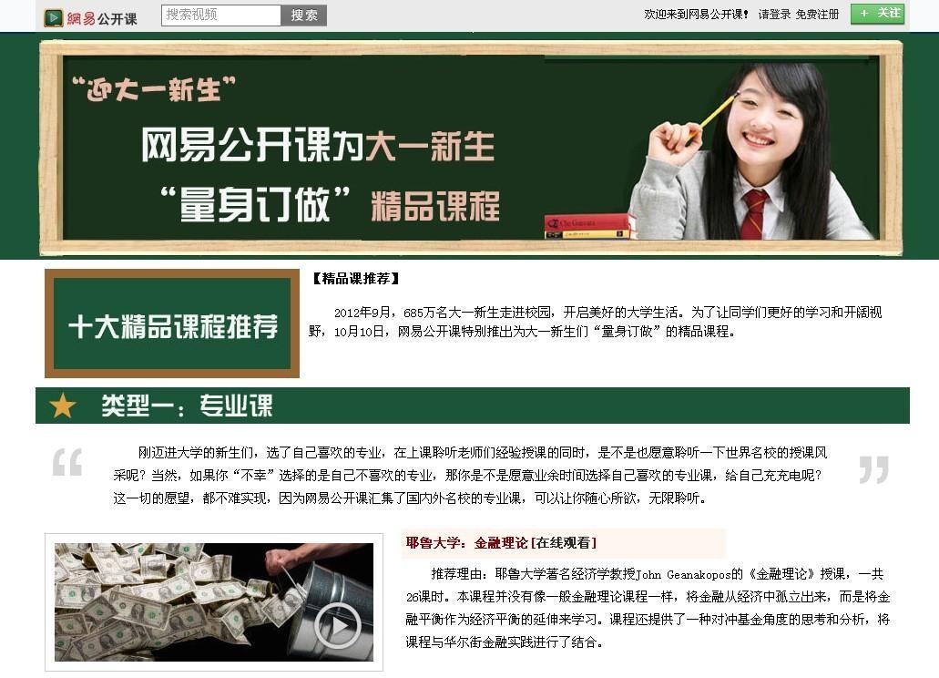10月11日,網(wǎng)易公開(kāi)課針對(duì)大一新生,特別推出了以上“量身訂做”的精品課程。該課程涵蓋專業(yè)課、基礎(chǔ)課、公共課、興趣課四大部分,多方面的給大一新生提供學(xué)習(xí)和生活支持。網(wǎng)易公開(kāi)課相關(guān)負(fù)責(zé)人表示:“網(wǎng)易公開(kāi)課現(xiàn)有幾十所國(guó)際國(guó)內(nèi)大學(xué)的課程、TED演講以及可汗學(xué)院,以后還會(huì)增加更多優(yōu)秀課程,努力打造成網(wǎng)上綜合大學(xué)?!?/p>