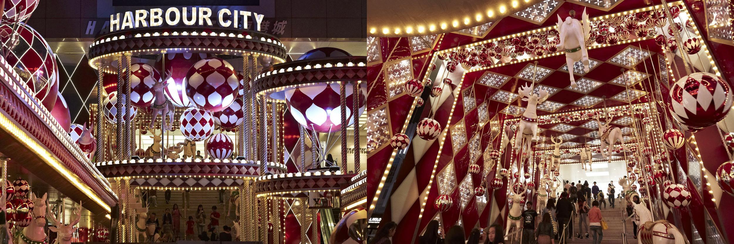 海港城今年的圣誕主題為“圓滿愛(ài)”,海港城海運(yùn)大廈露天廣場(chǎng)的圣誕布置以“旋轉(zhuǎn)木馬”和“夢(mèng)幻馬戲團(tuán)”為設(shè)計(jì)概念。整個(gè)裝飾長(zhǎng)達(dá)50米,從五枝旗桿伸廷至海港城海運(yùn)大廈正門(mén)入口,并首次把廣場(chǎng)兩旁全面布置。