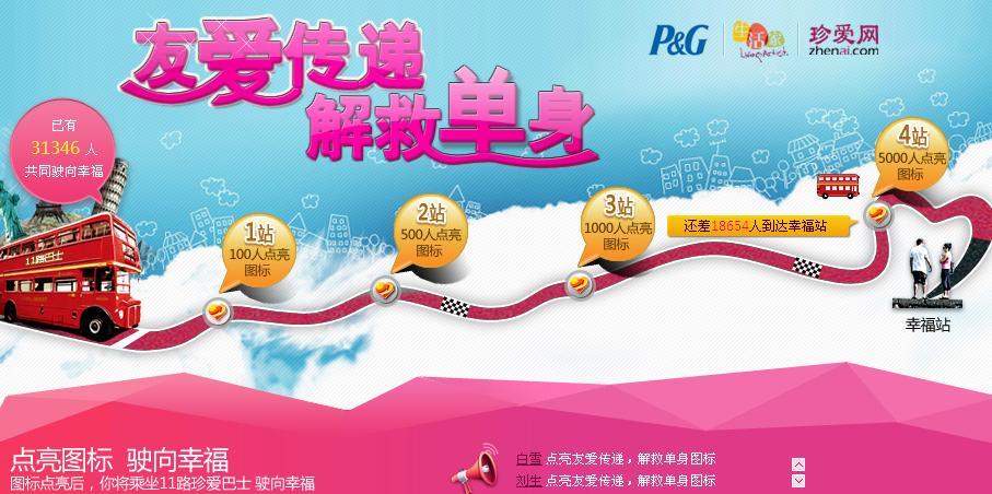 此次活動集合了珍愛網(wǎng)、寶潔以及國內(nèi)各大電商網(wǎng)站(天貓、京東商城、亞馬遜、一號店、蘇寧易購、繽購網(wǎng)、當(dāng)當(dāng)網(wǎng)),全網(wǎng)覆蓋為解救單身提供了更全面和方便的方式。在生活家網(wǎng)站上參與 “‘友’愛傳遞,解救單身”活動,分享情感專家的脫光秘籍并@上你的單身好友,即可參加iPad 2抽獎,更可獲得在所選電商平臺的寶潔產(chǎn)品購物券,以優(yōu)惠價格購得產(chǎn)品并造就“脫光”大變身;單身好友更有機(jī)會被抽中獲得珍愛網(wǎng)2999元的珍愛通紅娘服務(wù)。通過該活動注冊成為每日前1000名的珍愛網(wǎng)新用戶,亦將獲得試用會籍擁有3枚珍愛幣,以此購買禮物可更好地接近心儀對象。珍愛網(wǎng)負(fù)責(zé)人表示:“過去普通會員只能向?qū)Ψ健颓锊ā?,參與該活動獲得珍愛幣,就可以有更多示愛表白的機(jī)會。在寶潔‘脫單’產(chǎn)品的幫助下再乘勝出擊約見心儀會員,將是一次加速脫光的好機(jī)會!”