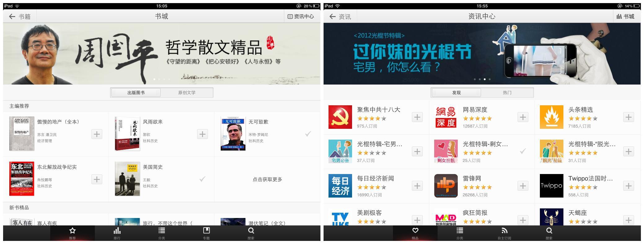 在點擊資訊/書籍按鈕后,網(wǎng)易云閱讀中為用戶呈現(xiàn)的是兩個截然不同的閱讀生態(tài)圈。資訊內(nèi)容主體中,用戶可以隨意訂閱到目前互聯(lián)網(wǎng)上所有的主流資訊內(nèi)容,并通過雜志化的形式呈現(xiàn):頂部內(nèi)容源LOGO高清小標、隨字體大小自動調(diào)節(jié)的頁面內(nèi)容分欄、多種內(nèi)容排版方式,將各類不同的互聯(lián)網(wǎng)資訊完美整合為移動雜志。而在書籍內(nèi)容主體中,網(wǎng)易云閱讀則為用戶提供了10萬多冊出版/原創(chuàng)圖書隨意下載,并通過高仿實體書的電子書閱讀器,對內(nèi)容進行完美呈現(xiàn)。