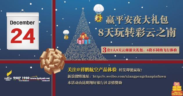 昆明2012年12月4日電 /美通社/ -- 參與微博活動,隨手轉(zhuǎn)發(fā)即可獲得8天云南旅游大禮包。12月3日開始,云南祥鵬航空注冊于新浪的航空產(chǎn)品專屬微博@祥鵬航空產(chǎn)品體驗 將再次舉辦惠民活動。聯(lián)合昆明翔好旅行社,本次微博活動的禮品會把飛行與旅行體驗結(jié)合在一起,送出3套2人8天7夜的云南旅行大禮包,其中包含4段飛行過程。而擁有獲得上述禮物的機會,僅需登陸微博參與@祥鵬航空產(chǎn)品體驗 的微博轉(zhuǎn)發(fā)活動即可?;顒訒r間截止12月24日,大禮將于平安之夜發(fā)放。