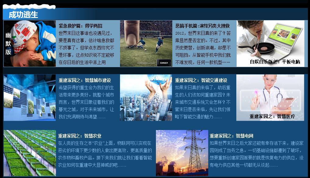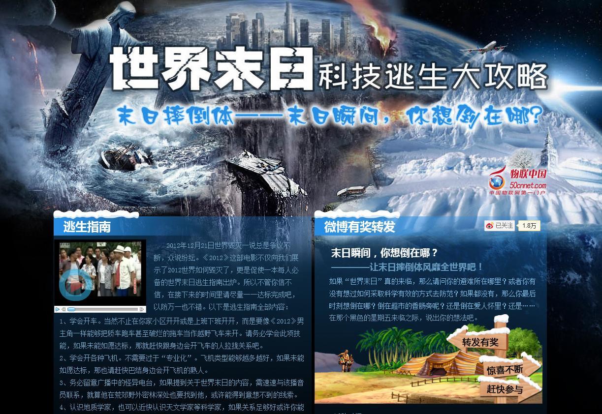 物聯(lián)中國(guó)“世界末日科技逃生大攻略”專題主要分為“逃生指南、必備清單、微博有獎(jiǎng)轉(zhuǎn)發(fā)、制高點(diǎn)、避難所、諾亞方舟、成功逃生、重建家園、未發(fā)生災(zāi)難、網(wǎng)友互動(dòng)”十大版塊,內(nèi)容只能以“各種搞笑”來形容。