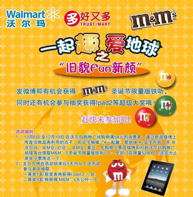 即日起至2月9日,全國范圍的沃爾瑪購物廣場、好又多門店還攜手可口可樂,邀顧客“新年抽大獎,iPad mini拿回家”。凡在任一沃爾瑪、好又多門店購物滿一定金額,且采購的商品包括可口可樂任意產(chǎn)品,即可參與抽獎。每店設一名特別獎,將獲得WLAN機型16GB iPad mini一臺;10名幸運獎,將獲得可口可樂汽水一箱(330毫升24罐裝)。各門店將于2月17日進行抽獎活動,并與獲獎顧客聯(lián)系(詳情請咨詢店內(nèi)服務臺)。