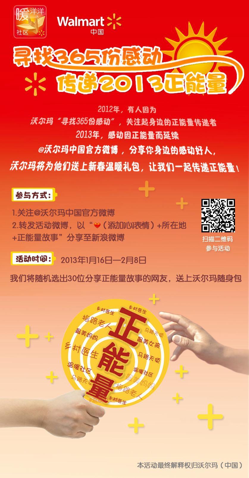 “尋找365份感動”微公益活動是沃爾瑪中國的品牌春節(jié)公益項目,自2011年起,將在每年的春節(jié)期間推出。活動將邀請大家關(guān)注“@沃爾瑪中國官方微博”,轉(zhuǎn)發(fā)活動主貼,并將“正能量”故事分享至新浪微博(活動第一階段日期:即日起至2月8日)。沃爾瑪為正能量故事的主人公們精心準(zhǔn)備了新春禮包,并將隨機(jī)選出30位分享正能量故事的網(wǎng)友(網(wǎng)友名單將在春節(jié)后發(fā)布),送上沃爾瑪隨身包。此外,“@沃爾瑪中國官方微博”還將定期發(fā)布員工志愿者組織的愛心活動,邀請大家報名參與。