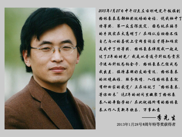 季先生是格林豪泰鉑金卡會(huì)員,從2008年開始就入住格林豪泰,也算是格林豪泰的一名老顧客。“一般出差或者招待朋友、客人,都會(huì)選擇格林豪泰酒店,格林豪泰舒適、干凈的入住體驗(yàn),以及滿意周到的服務(wù)是我選擇格林豪泰的理由,很感謝格林豪泰舉辦這次活動(dòng)”!被問(wèn)及獲獎(jiǎng)感言時(shí),季先生響亮地喊出了格林豪泰的宣傳語(yǔ) -- “格林豪泰,等您回來(lái)”!