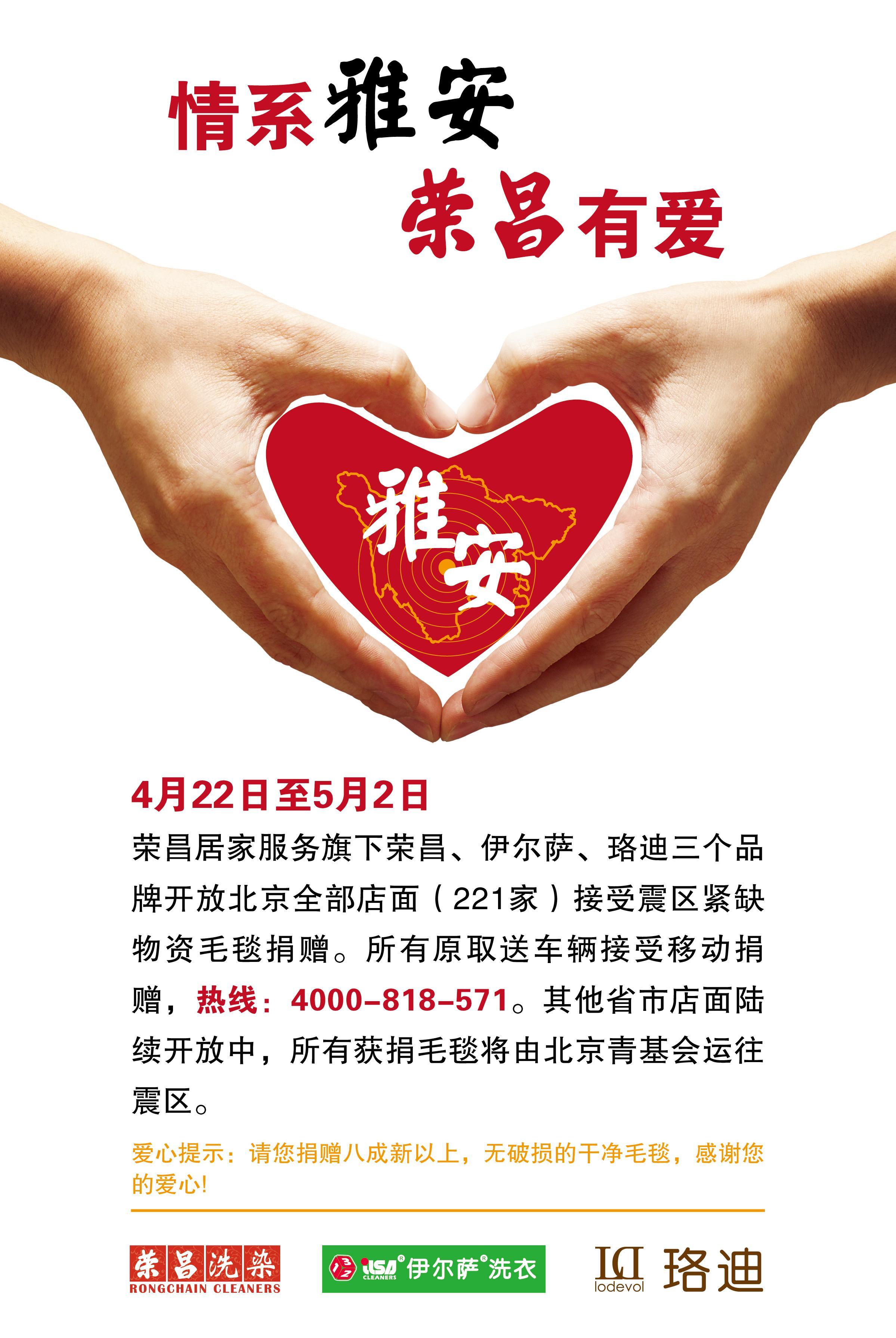 雅安2013年4月23日電 /美通社/ -- 雅安地震,牽動著每位國人的心。面對災區(qū)受難同胞保暖御寒物資緊缺局面,4月22日至5月2日,榮昌居家服務(wù)旗下榮昌、伊爾薩、珞迪三個品牌開放北京全部店面(221家)接受震區(qū)緊缺物資毛毯的捐贈。公司所有原幾十輛取送車輛也將全部在北京市區(qū)內(nèi)接受移動捐贈,熱線:4000-818-571。同時,榮昌公司將捐出4月26日(七日祭)當天直營店的全部收入。其他省市店面陸續(xù)開放中,所有獲捐毛毯將由北京青基會運往震區(qū)。