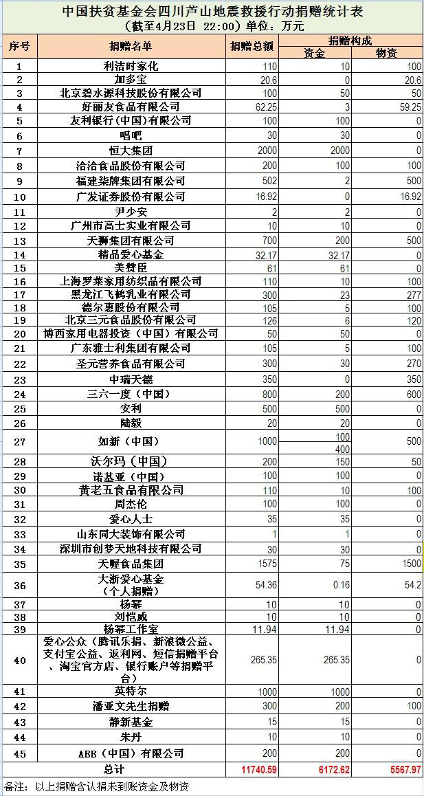 中國扶貧基金會四川蘆山地震救援行動接收捐贈統(tǒng)計表