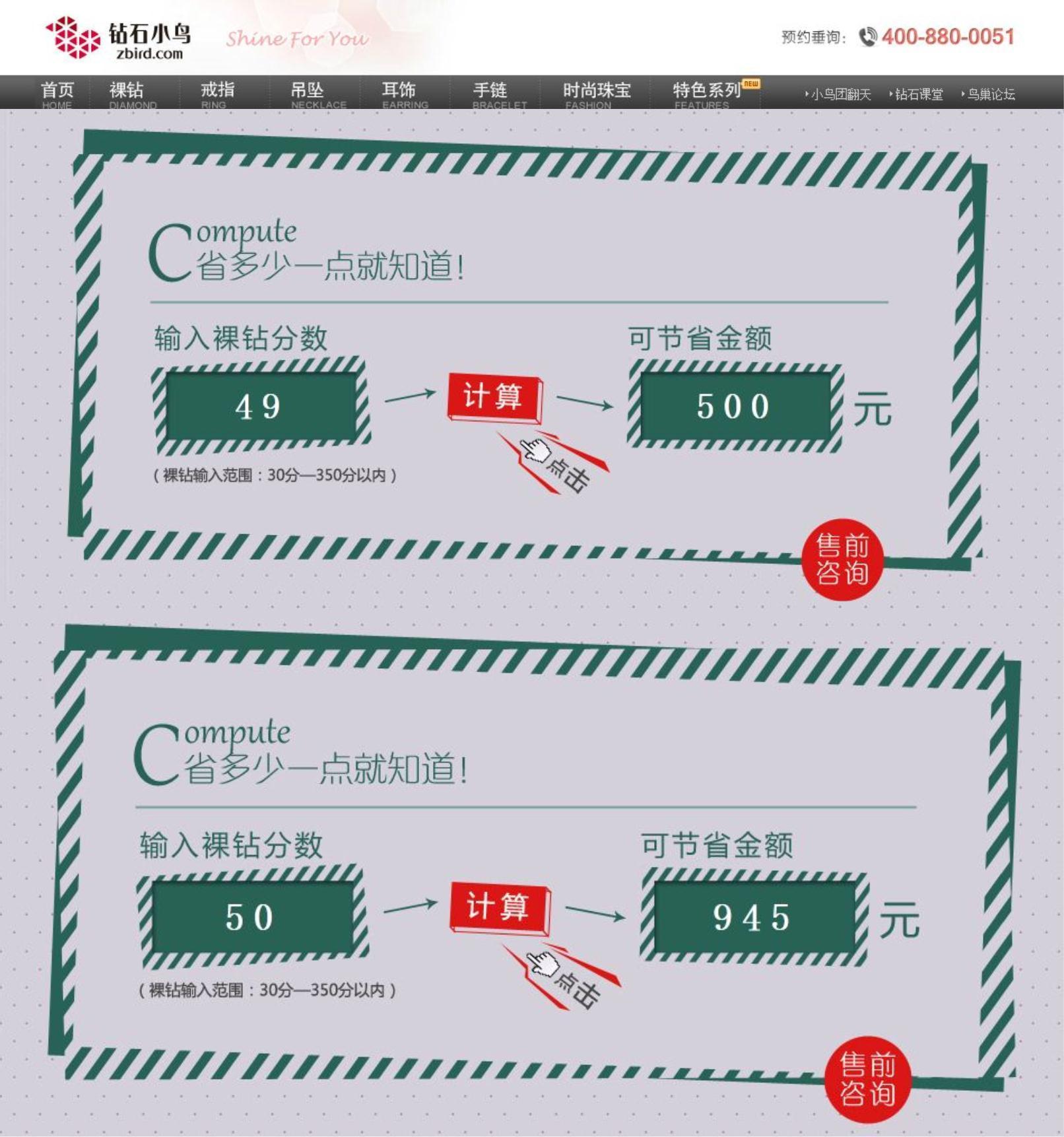 王小姐說:“本來因為結(jié)婚的預(yù)算有限,只打算買30多分的裸鉆,對比后發(fā)現(xiàn),鉆石小鳥的價格比商場專柜要省40%左右,于是就買了50分的,剛好最近看到五一促銷的這個活動的訊息,我特地算過,49分與50分鉆石相比的話,49分可省500元,而50分卻能省945元?!?/p>