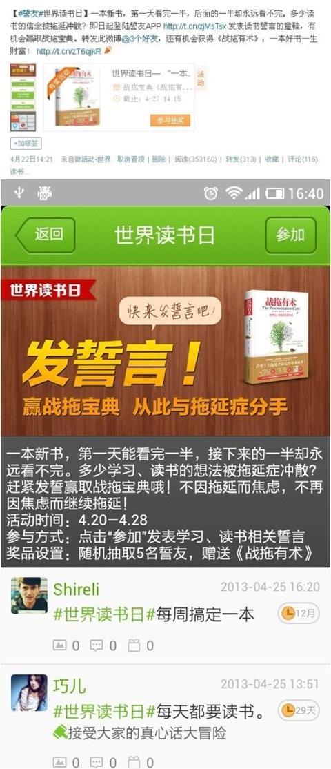 4月23日,《誓友》在手機(jī)平臺和官方微博雙雙推出“讀書日戰(zhàn)拖”主題線上活動http://event.weibo.com/824246 ,獎品是由含章行文提供的《戰(zhàn)拖有術(shù)》,得到了廣大網(wǎng)友的熱情參與,截止活動結(jié)束時,微博活動閱讀參與突破36萬次。