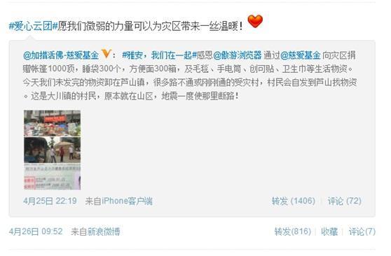 目前,傲游向四川災區(qū)捐贈救災物資的工作正在緊張開展。委托@加措活佛-慈愛基金 向災區(qū)捐贈了帳篷1000頂,睡袋300個,方便面300箱,創(chuàng)可貼300包,以及若干毯子、雨衣、女性用品、手電筒、幼兒用品等災區(qū)急需物資。并且在物資采購到位后,傲游還派出一名專業(yè)的傲游志愿者深入災區(qū),協(xié)助基金會進行救助活動,一同保障物資能以較快速度送達災區(qū)。在災難面前,傲游用切實的行動展現(xiàn)了互聯(lián)網(wǎng)企業(yè)在危難時刻的擔當。