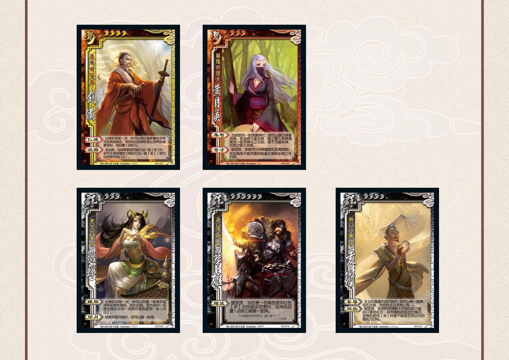 北京2013年5月20日電 /美通社/ -- 5月20日,游卡桌游重量級(jí)產(chǎn)品《三國(guó)殺 2013 標(biāo)準(zhǔn)版》正式發(fā)售,本次改版官方積極匯總玩家提出的建設(shè)性意見,同時(shí)依據(jù)《三國(guó)殺Online》和線下測(cè)試的結(jié)果,重新制定了劉備、貂蟬、黃月英等武將的技能,并加入了華雄、袁術(shù)兩名新武將,使《三國(guó)殺》的競(jìng)技性和娛樂性達(dá)到了一個(gè)新的高度。五名新武將均以全新形象登場(chǎng),下面讓我們先睹為快。