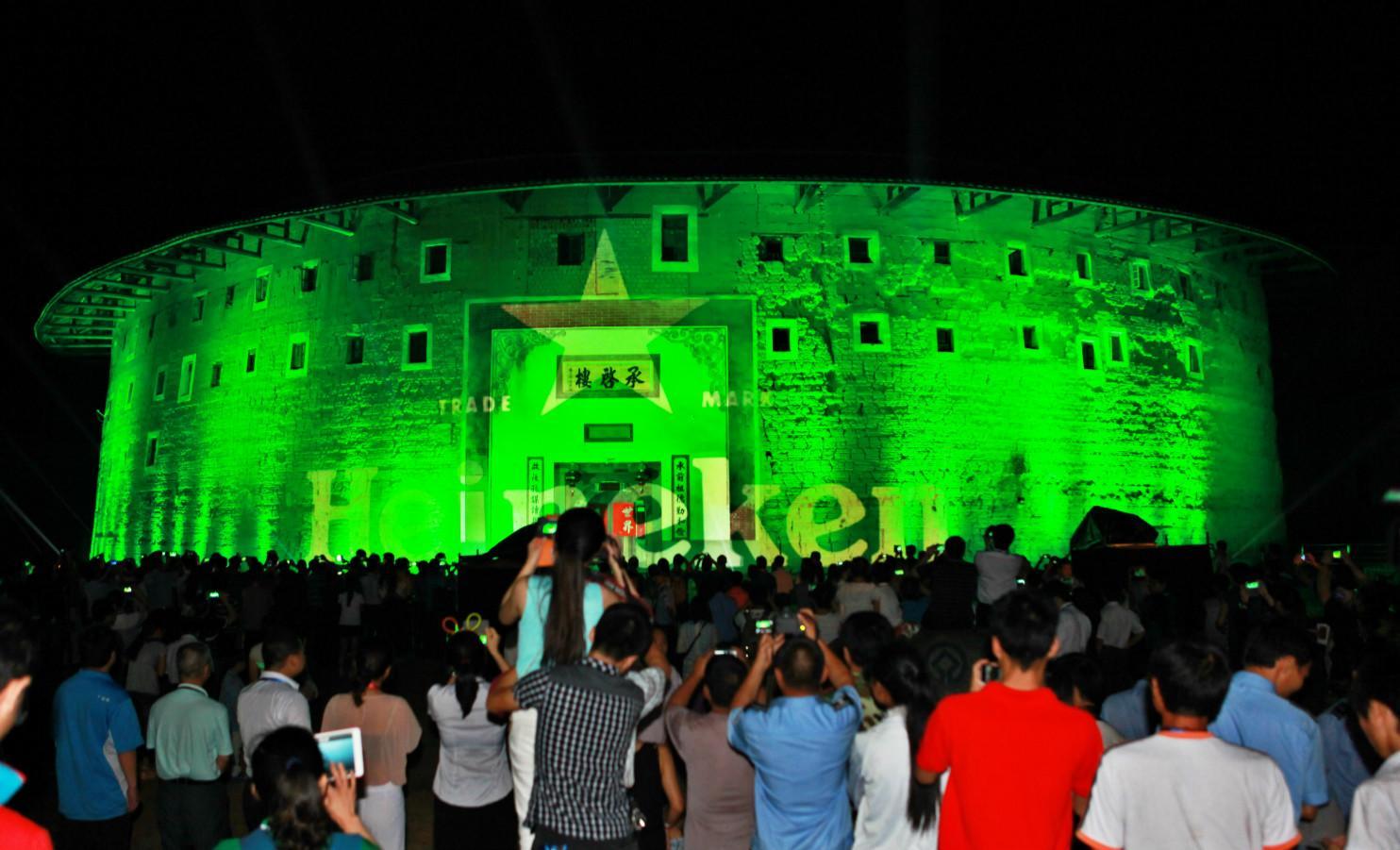決賽當(dāng)天,近三百名球迷們抵達(dá)歷史悠久、規(guī)模宏大的福建龍巖永定土樓,一起登樓遠(yuǎn)眺,而精心準(zhǔn)備的“發(fā)現(xiàn)土樓星視覺(jué)”攝影比賽、優(yōu)雅傳統(tǒng)的茶道和古箏迎賓表演,也將熱情獨(dú)特的客家風(fēng)土人情一一展現(xiàn)在球迷面前。當(dāng)夜幕降臨,喜力啤酒的Logo以裸眼3D的形式投影在“土樓之王”承啟樓墻體,開(kāi)啟華麗璀璨的裸眼3D秀,瑰麗的視覺(jué)效果與氣勢(shì)恢弘的土樓交相輝映,瞬間點(diǎn)燃全場(chǎng)球迷的激情,2013喜力歐冠決賽觀戰(zhàn)夜震撼開(kāi)場(chǎng)。
