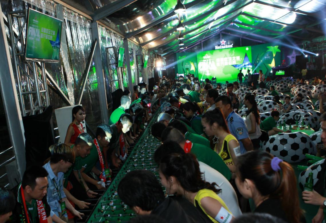 在決賽開(kāi)始前,喜力啤酒更準(zhǔn)備了精彩的表演和豐富的互動(dòng)節(jié)目。主舞臺(tái)上熱力四射的表演贏得了在場(chǎng)球迷的陣陣歡呼,在臺(tái)下的擂臺(tái)區(qū),喜力桌上足球歐冠賽的全國(guó)總決賽也鳴槍開(kāi)戰(zhàn)。分別來(lái)自大連、廣州、長(zhǎng)春、廈門(mén)、常州及去年衛(wèi)冕冠軍廣州隊(duì)的六支隊(duì)伍的好手奮力廝殺突出重圍,觀戰(zhàn)的球迷也激情助力搖旗吶喊,最終衛(wèi)冕冠軍廣州隊(duì)在開(kāi)場(chǎng)不利的形勢(shì)下反敗為勝,蟬聯(lián)2013年度桌上歐冠賽的總冠軍,贏得壹萬(wàn)元現(xiàn)金大獎(jiǎng)。而場(chǎng)地內(nèi)另一個(gè)聚焦關(guān)注的大亮點(diǎn),當(dāng)屬長(zhǎng)達(dá)40米的喜力桌上足球賽球桌,即時(shí)啟動(dòng)的桌上足球挑戰(zhàn)賽,容納50對(duì)50人同場(chǎng)競(jìng)技,PK挑戰(zhàn)無(wú)極限,百人對(duì)戰(zhàn)的宏大場(chǎng)面將賽前活動(dòng)推向另一個(gè)高潮。