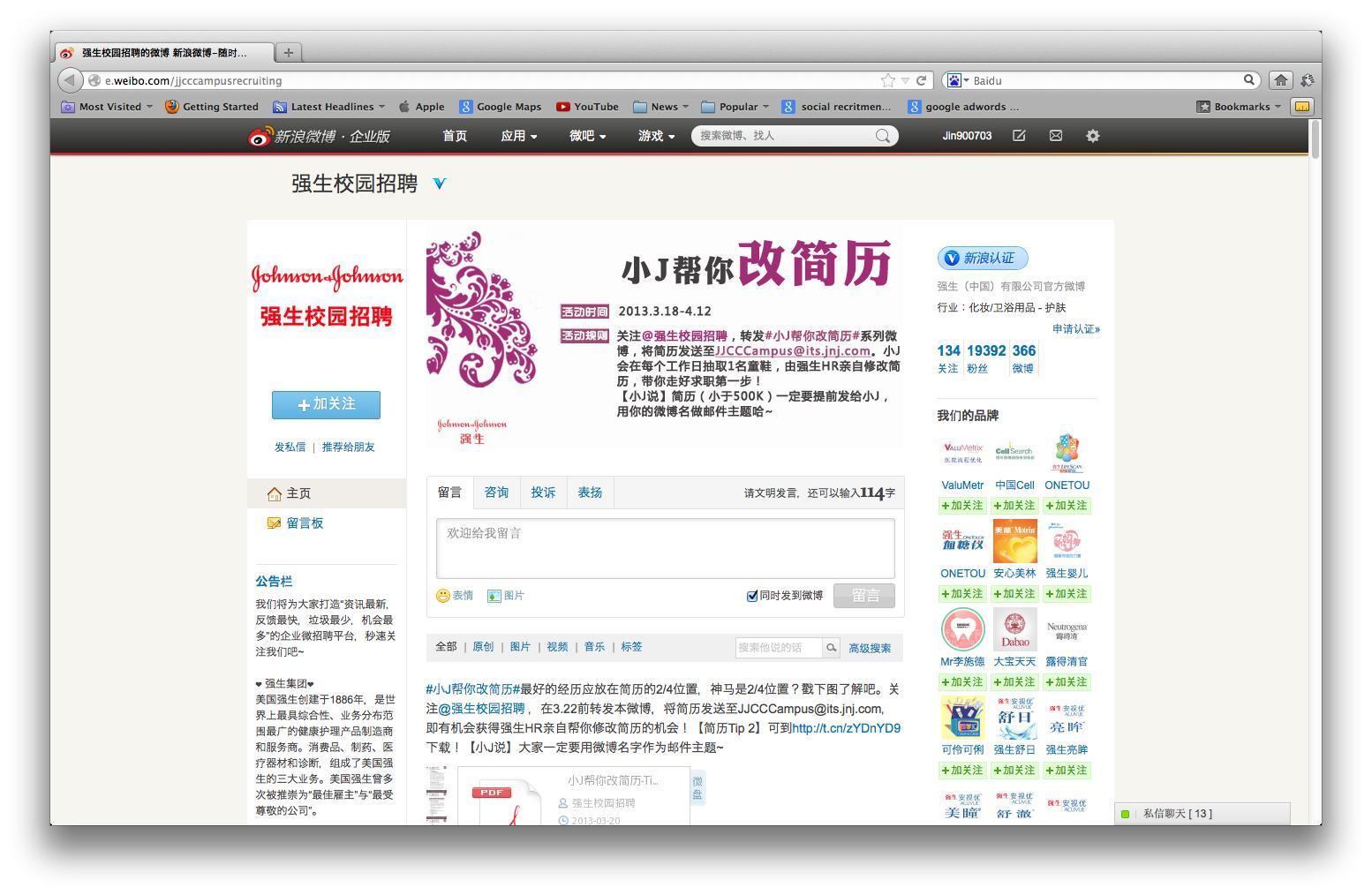 毋庸置疑,對于企業(yè)而言,為了使社交媒體賬戶擁有更大訪問量,舉辦活動始終是一種非常好的方法。然而 ,我們卻見許多企業(yè)將原本應(yīng)以“分享與評論”為主題的活動變?yōu)椤瓣P(guān)注并抽獎”的形式。盡管后者也能達到品牌推廣的目的,但是與前者相比,這種互動方式常常只能產(chǎn)生較低的參與率。最近,強生集團在其新浪微博校園招聘賬戶上發(fā)起了一項名為“小J幫你改簡歷”的活動。在參與活動的過程中,學(xué)生們可以將個人簡歷發(fā)給強生集團并且對相關(guān)活動內(nèi)容進行評論和轉(zhuǎn)發(fā)。每一天,強生集團人力資源部會選出一份簡歷對其進行修改,并將修改樣本發(fā)布在其微博平臺供學(xué)生們下載、參考。這個活動的亮點部分,是使粉絲有機會獲得專業(yè)意見,并且從中獲益,從而不僅確保了參與率,同時提高了雇主品牌影響力。