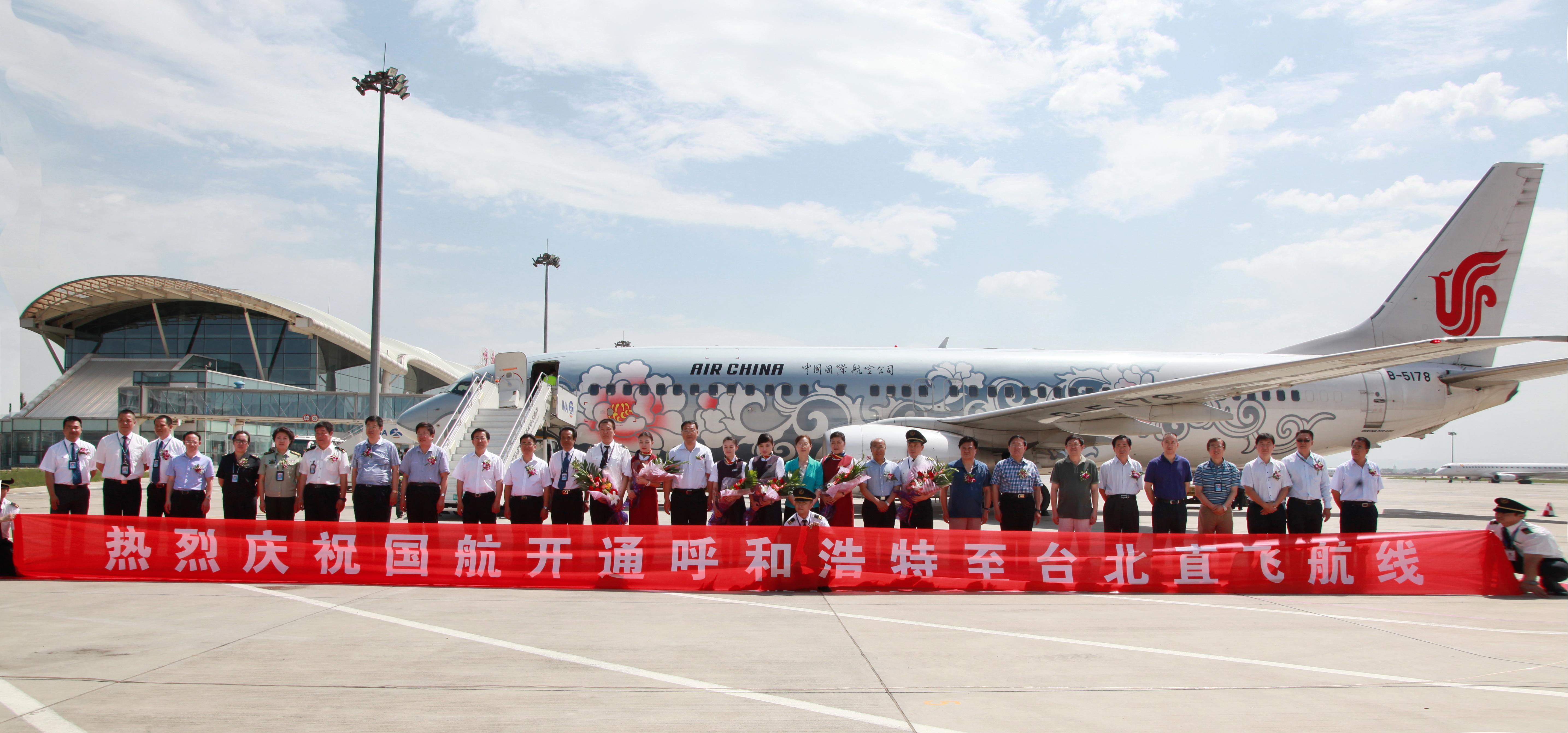 北京2013年6月26日電 /美通社/ -- 2013年6月25日上午,一架載有國航鳳凰標志的波音738飛機飛離呼和浩特白塔國際機場,直飛臺北桃園機場。中國國際航空股份有限公司(以下簡稱“國航”)呼和浩特-臺北航線首航成功。