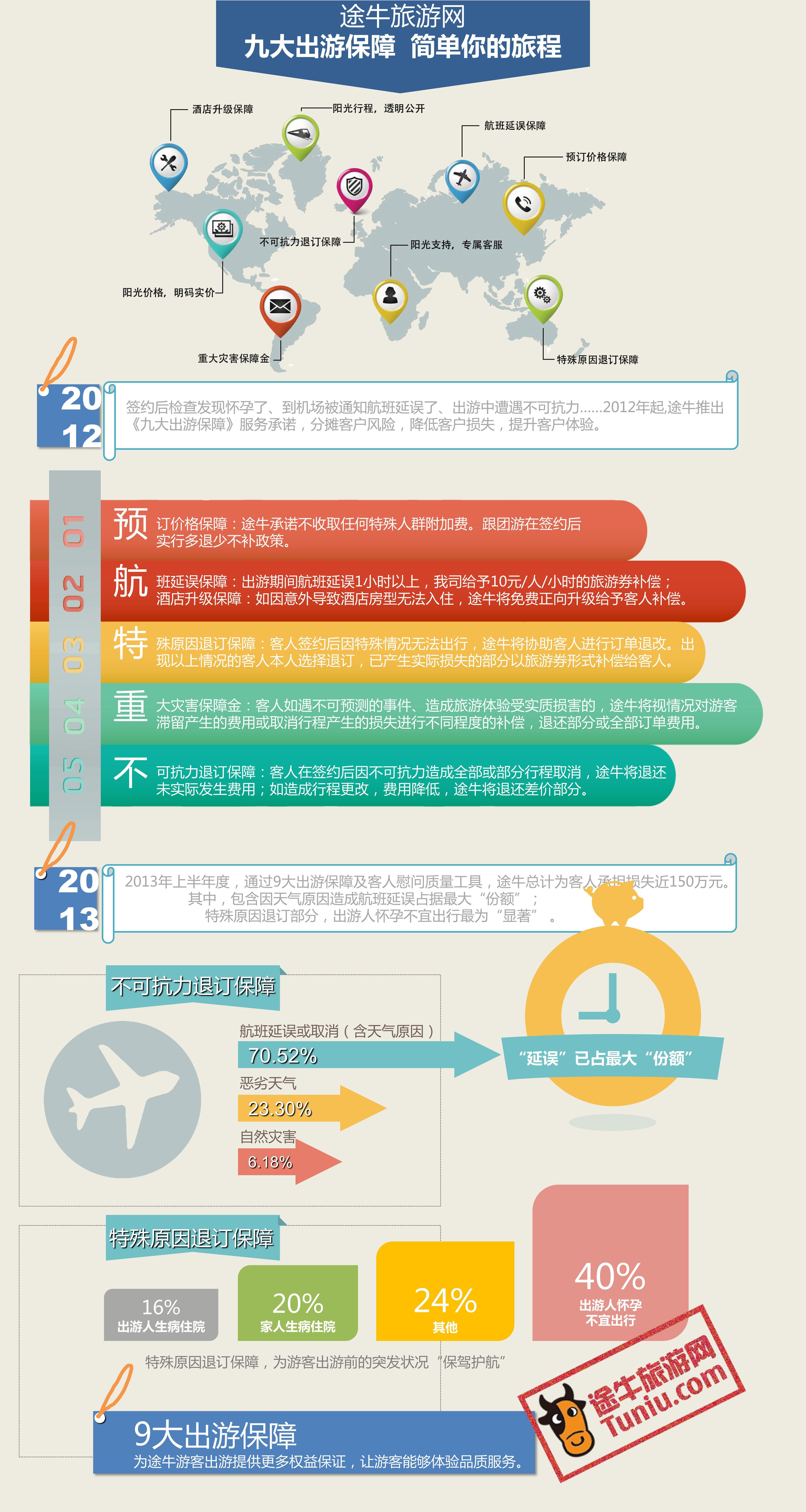 北京和上海2013年7月30日電 /美通社/ -- 簽約后檢查發(fā)現(xiàn)懷孕了、到機(jī)場(chǎng)被通知航班延誤了、出游中遭遇不可抗力……自2012年起,途牛旅游網(wǎng)推出《九大出游保障》服務(wù)承諾,分?jǐn)偪蛻麸L(fēng)險(xiǎn),降低客戶損失,提升客戶體驗(yàn)。