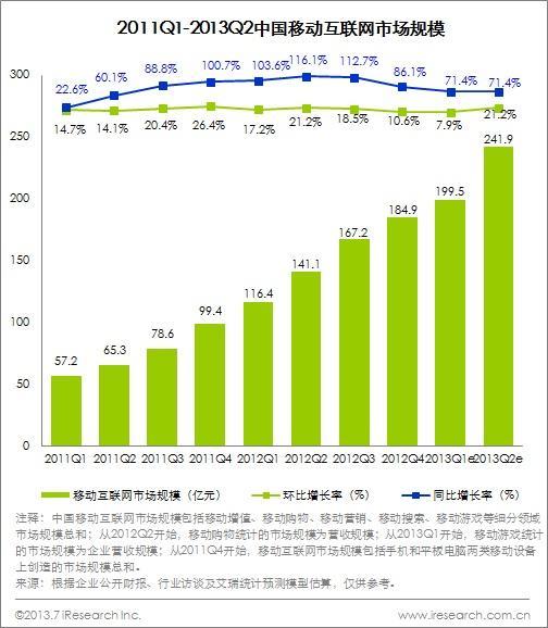 2013Q2移動(dòng)互聯(lián)網(wǎng)市場(chǎng)規(guī)模241.9億元,環(huán)比增速21.2%,同比增速71.4%,市場(chǎng)趨于穩(wěn)健發(fā)展。艾瑞認(rèn)為,2013年移動(dòng)互聯(lián)網(wǎng)市場(chǎng)發(fā)展逐漸明朗,商業(yè)模式探索進(jìn)一步深入,有望在今年得到突破。主要在于:一是傳統(tǒng)互聯(lián)網(wǎng)公司投資并購(gòu)不斷,延續(xù)PC優(yōu)勢(shì)的同時(shí)不斷補(bǔ)齊自身短板,移動(dòng)戰(zhàn)略布局基本完成;二是傳統(tǒng)行業(yè)企業(yè)進(jìn)一步認(rèn)可移動(dòng)互聯(lián)網(wǎng)商業(yè)價(jià)值,積極投身參與,進(jìn)一步推動(dòng)市場(chǎng)向前發(fā)展。