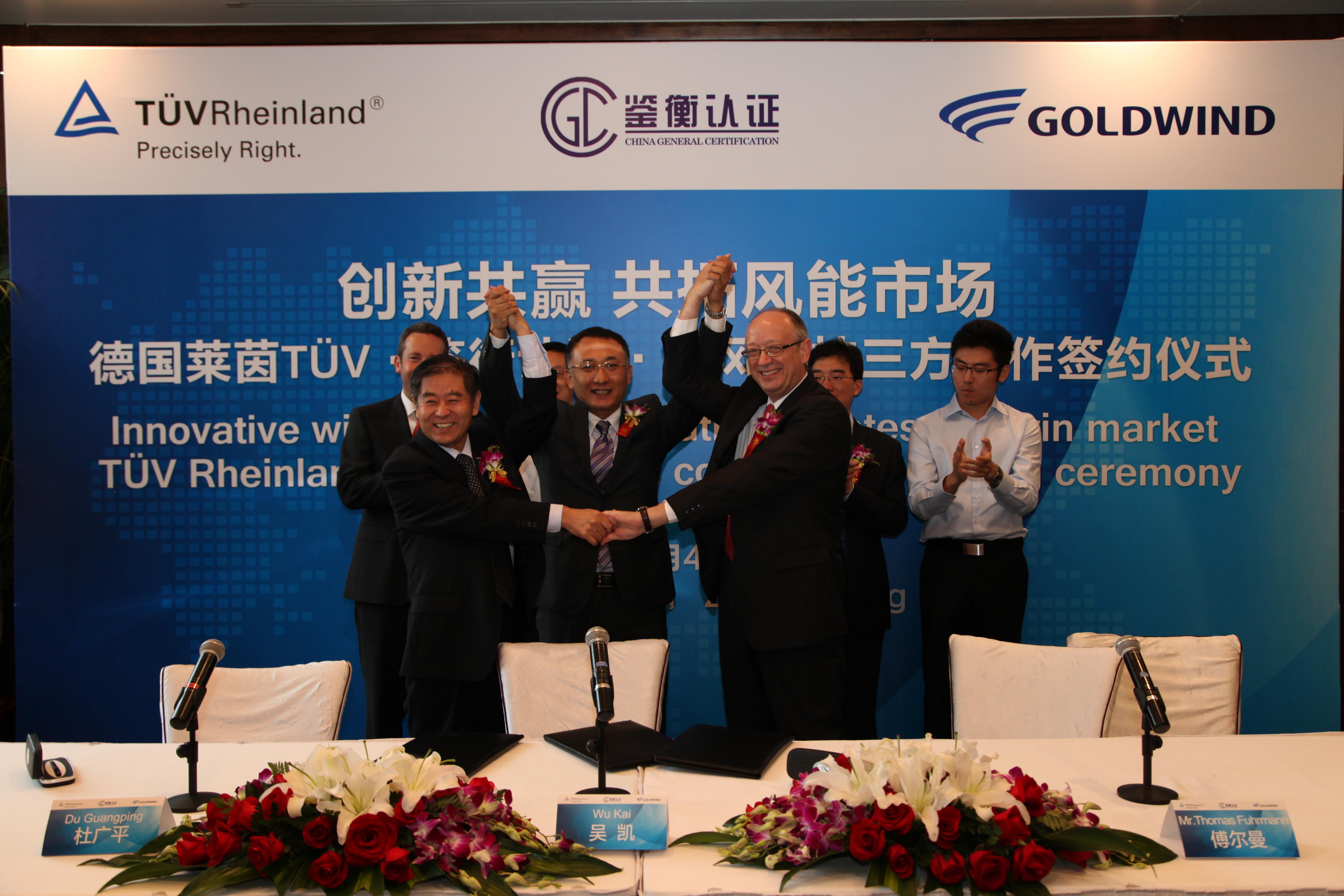 北京2013年9月5日電 /美通社/ -- 2013年9月4日,德國萊茵TUV集團(以下簡稱“萊茵TUV”)牽手北京鑒衡認證中心(以下簡稱“鑒衡認證”)與新疆金風科技股份有限公司(以下簡稱“金風科技”)在京共同簽署風電機組認證委托協(xié)議。國家可再生能源中心主任助理趙勇強、德國萊茵TUV工業(yè)服務(wù)全球總裁韓伯格、鑒衡認證中心主任秦海巖、金風科技副總裁、研發(fā)業(yè)務(wù)單元總經(jīng)理吳凱等出席簽字儀式。
