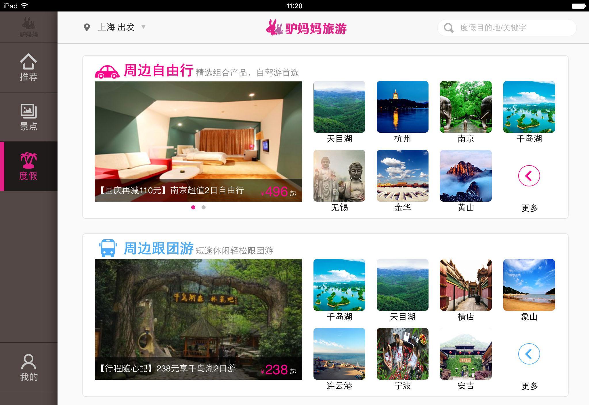 全新驢媽媽iPad版客戶端提供了基于門票、周邊自由行、周邊跟團(tuán)游、長途游、出境游等多種類型產(chǎn)品的訂購服務(wù)。為方便用戶查找出游目的地,客戶端還開發(fā)了超實(shí)用的目的地搜索功能,用戶可通過頻道頁面右上方點(diǎn)選“景點(diǎn)/目的地”、“度假/目的地”,根據(jù)各自出游目的地搜索到相關(guān)產(chǎn)品進(jìn)行預(yù)訂。