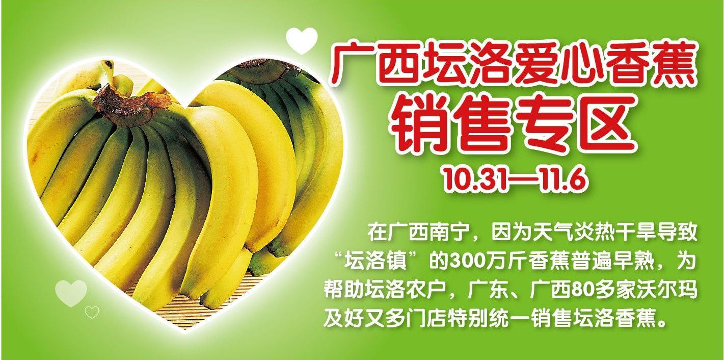 中國(guó)南寧2013年11月4日電 /美通社/ -- 因天氣炎熱干旱,廣西南寧壇洛鎮(zhèn)的300萬斤香蕉普遍早熟,使上市高峰提前來到,熟蕉賤賣卻仍無人問津,蕉農(nóng)損失慘重。沃爾瑪?shù)弥闆r后,迅速與香蕉商會(huì)對(duì)接,收購(gòu)近8.5噸香蕉。10月31日起到11月6日,廣東、廣西80多家門店統(tǒng)一銷售愛心香蕉,幫助壇洛農(nóng)戶解決燃眉之急。