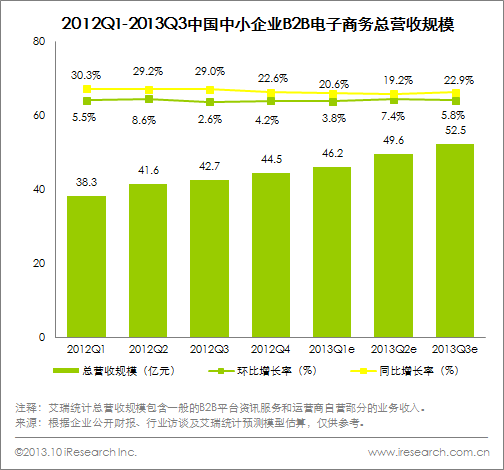 2013Q3中國(guó)中小企業(yè)B2B電子商務(wù)市場(chǎng)營(yíng)收52.5億元,增速平穩(wěn)