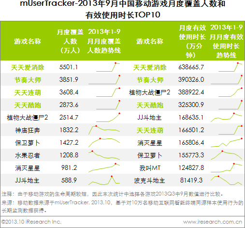 從2013年9月移動(dòng)游戲月度覆蓋人數(shù)和使用時(shí)長榜單中可以看到,2013Q3成為騰訊移動(dòng)游戲的天下,特別是微信平臺(tái)對(duì)于用戶的吸引巨大,從8月5日《打飛機(jī)》和《天天愛消除》在微信5.0 iOS平臺(tái)首推,短短兩個(gè)月時(shí)間已經(jīng)占據(jù)用戶覆蓋和使用時(shí)長前列,社交平臺(tái)本身的用戶黏性及社交屬性對(duì)于輕度游戲用戶的吸引力較強(qiáng)。另外9月Android平臺(tái)首發(fā)的《植物大戰(zhàn)僵尸2》也獲得了大量用戶,并且人均使用時(shí)長相比其他游戲更高。