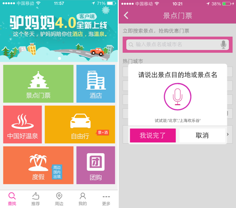 值得一提的是,本次驢媽媽旅游網(wǎng)手機(jī)客戶端4.0版還創(chuàng)新性地推出了特色頻道“語(yǔ)音搜索”。區(qū)別于以往用戶只能使用鍵盤或者手寫(xiě)輸入的方式訂購(gòu)旅游產(chǎn)品,驢媽媽新版手機(jī)客戶端的“語(yǔ)音搜索”功能將給用戶帶來(lái)全新的搜索體驗(yàn)。用戶只需對(duì)著手機(jī)說(shuō)出景點(diǎn)目的地或景點(diǎn)名稱、旅行或度假目的地等關(guān)鍵字,便可以輕松地獲得所需要的旅游資訊,將個(gè)性化和人性化的服務(wù)應(yīng)用于移動(dòng)客戶端。