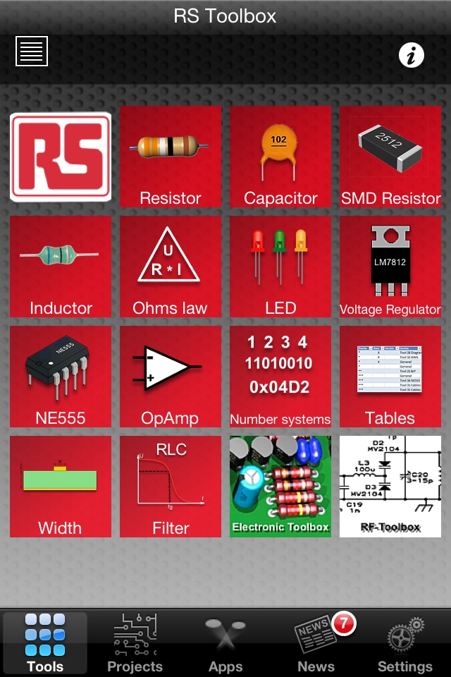 RS Toolbox 提供一系列廣泛的功能,均以圖標形式在主屏幕上分組呈現(xiàn),包括多種工程計算器、轉換器和查詢表。例如RLC濾波計算器,555定時配置器,用于各種穩(wěn)壓器和運算放大器的計算器,以及諸如編號系統(tǒng)轉換器和歐姆定律計算器等基本工具,還有包括電池類型與尺寸、電纜顏色編碼、封裝尺寸和螺線管規(guī)格等內容的查詢表。