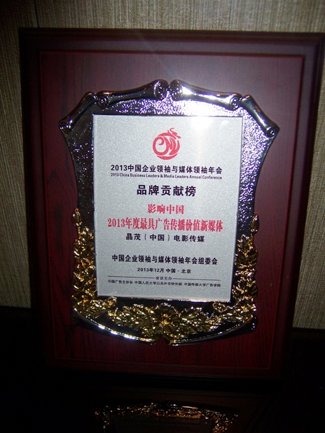 北京2013年12月17日電 /美通社/ -- 以“傳播正能量,共筑中國(guó)夢(mèng)”為主題,備受國(guó)內(nèi)企業(yè)界、傳媒界、廣告界、藝術(shù)界關(guān)注的“2013中國(guó)企業(yè)領(lǐng)袖與媒體領(lǐng)袖年會(huì)”暨“品牌貢獻(xiàn)榜年度盛典”,近日在北京金隅喜來(lái)登酒店盛大舉行。晶茂(中國(guó))電影傳媒喜獲品牌貢獻(xiàn)榜“2013年度最具廣告?zhèn)鞑r(jià)值新媒體”大獎(jiǎng)。