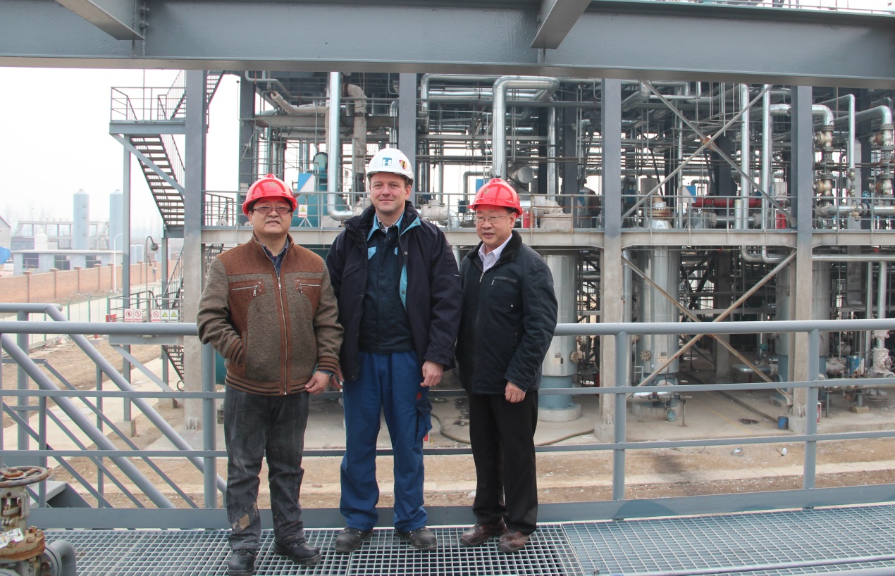 托普索高級工藝工程師Martin Jensen(中)與中海油山東新能源有限公司總工程師劉國軍(左一)和公司總經(jīng)理姚德彬先生(右一)在甲烷化裝置開車后合影