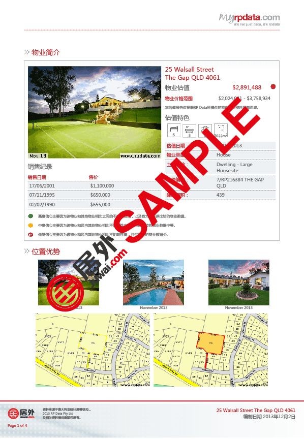 該報告為有意在澳大利亞置業(yè)的中國買家提供極具價值的房產(chǎn)信息,助其做出更明智更博識的投資決定。買家只要登陸居外網(wǎng)澳大利亞房源頁,選取任何一個房源,即可免費獲得該房源的詳細中文報告。報告涵蓋該房產(chǎn)的銷售歷史、小區(qū)銷售情況、區(qū)內(nèi)人口面貌、家庭收入和結(jié)構(gòu)分析、土地和房價價值評估。報告中所引述的數(shù)據(jù)均來自澳大利亞統(tǒng)計局等政府權(quán)威機構(gòu)。